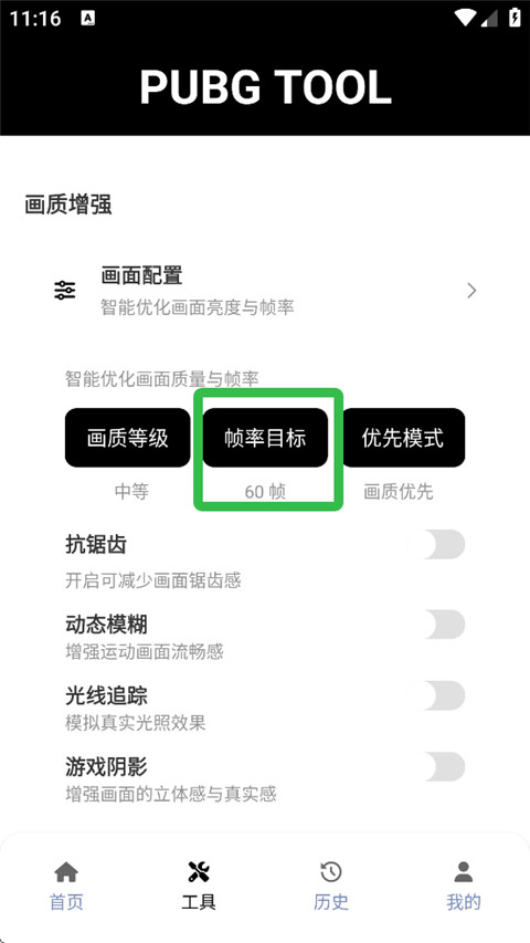 1、进入PUBGTool120帧画质助手,点击【解锁画质帧率】。