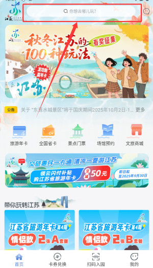 2、首页提供年度畅游卡及省份通票等特色服务的在线办理入口。