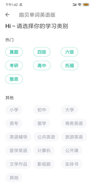 1、打开扇贝单词英语版,新用户会进入单词书推荐页面,可根据分类标签引导,选择自己想学的单词书。