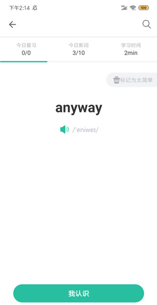 5、在单词自评页面点击右上角的【太简单】,则这个单词将被定义为简单词,不会在今后的学习中再次出现。