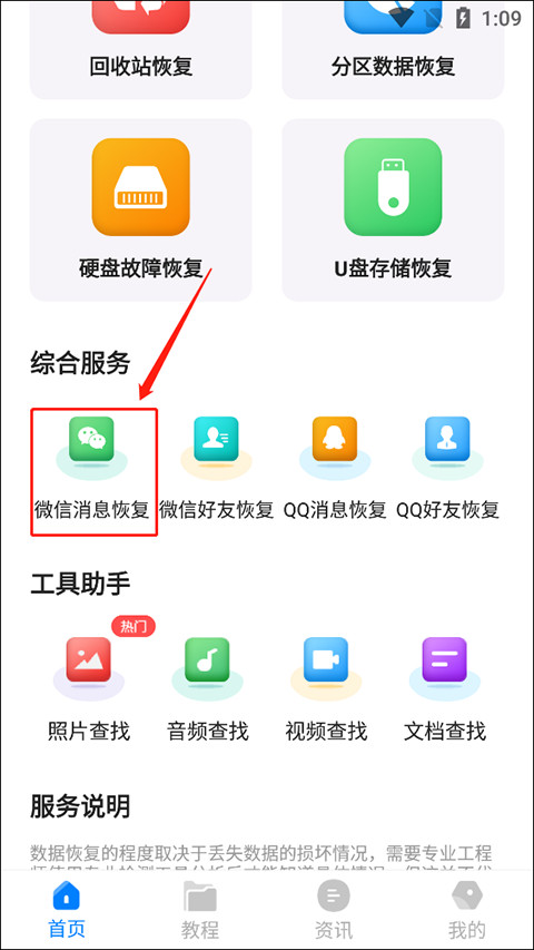 1、在这里下载软件,安装打开之后选择“微信消息恢复”。