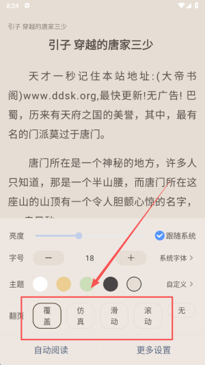 3.根据个人喜好设置文字大小、背景、亮度、翻页模式等