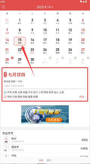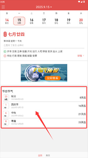 3、继续向下滑动屏幕,还能浏览相邻日期的节日与节气相关安排。