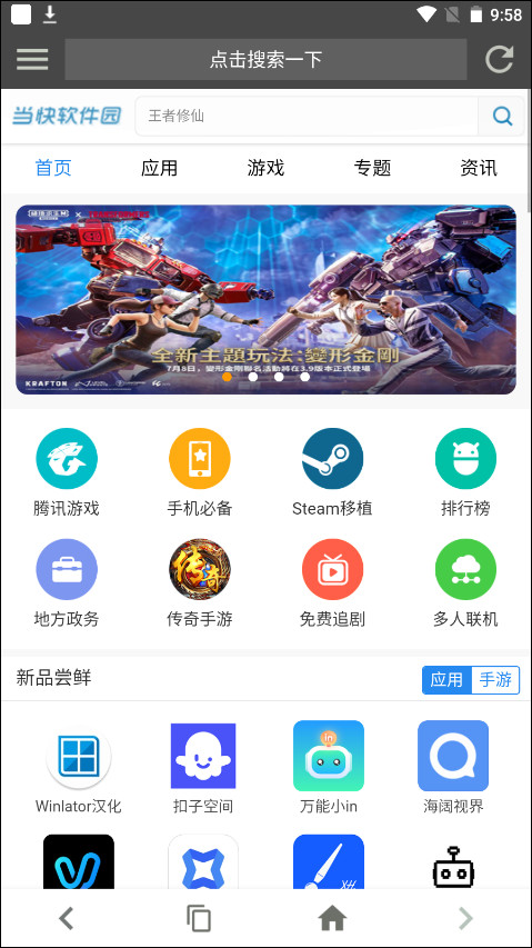 1、运行软件,点一下主页面搜索栏能够输入关键词或网址搜索,正下方能够便捷开启一些运用;