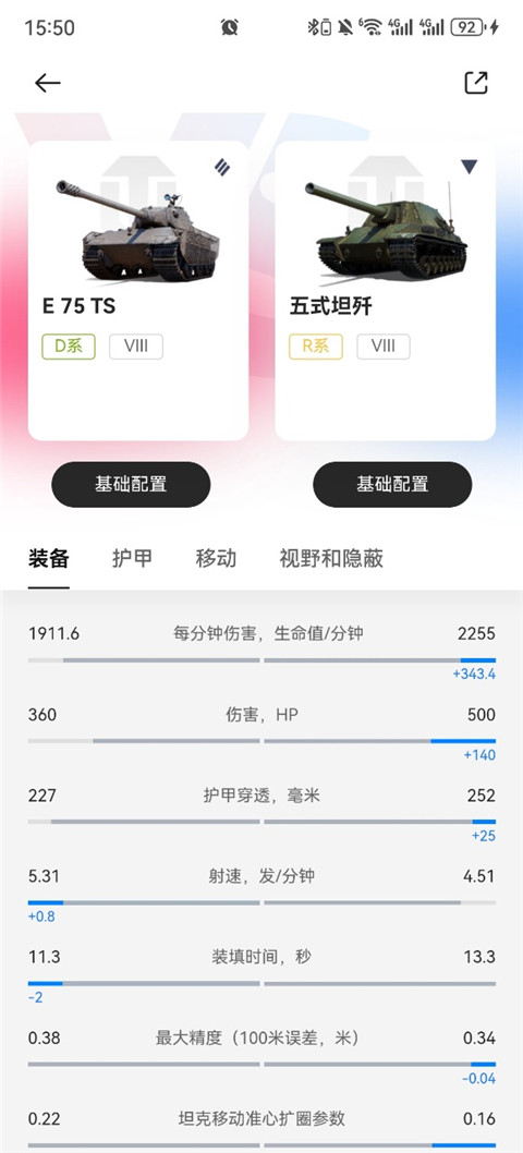 4、现在就可查看双方坦克的数据对比情况。