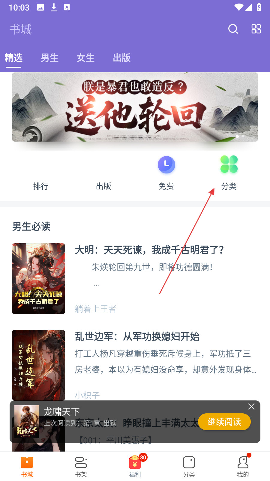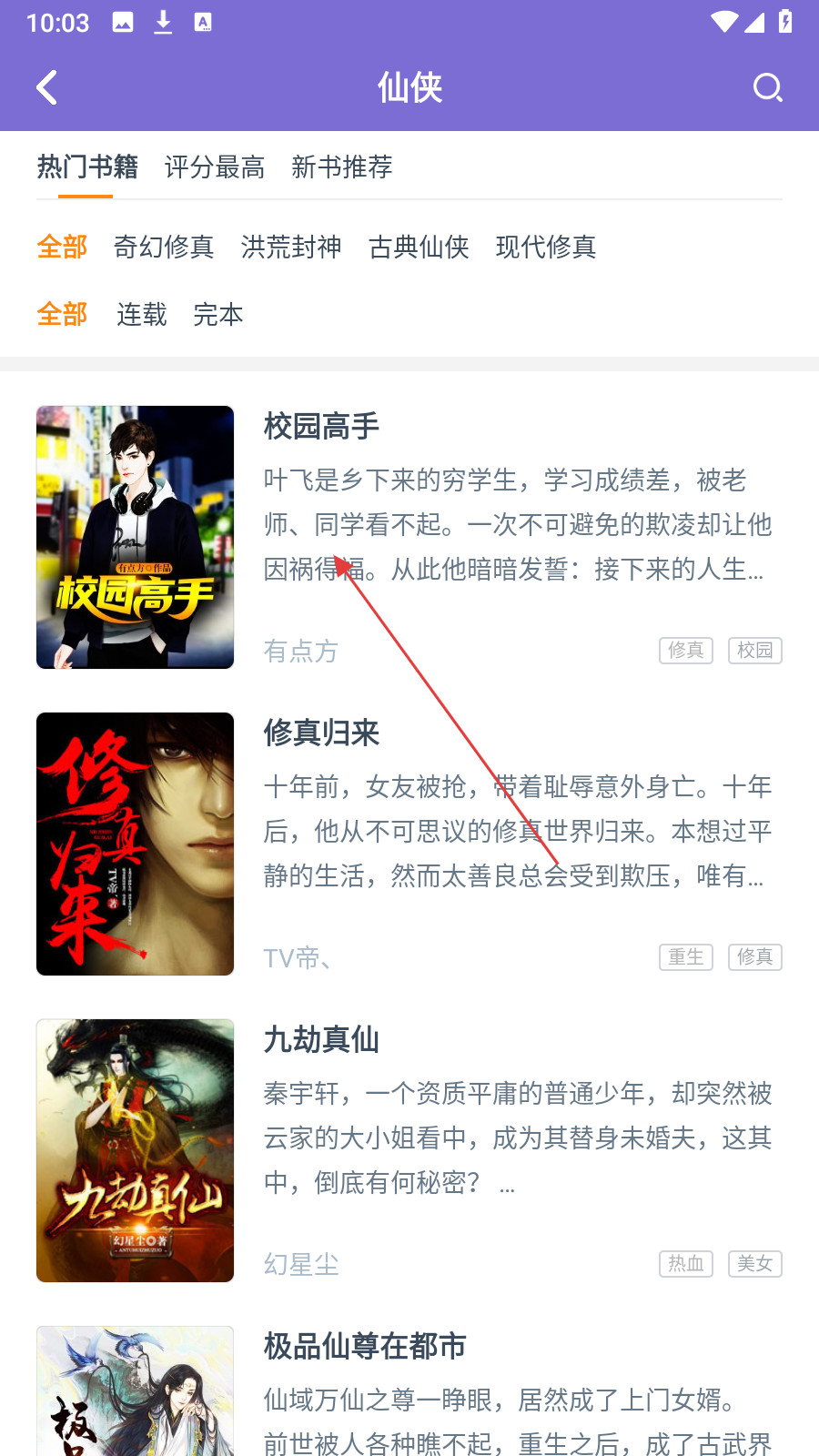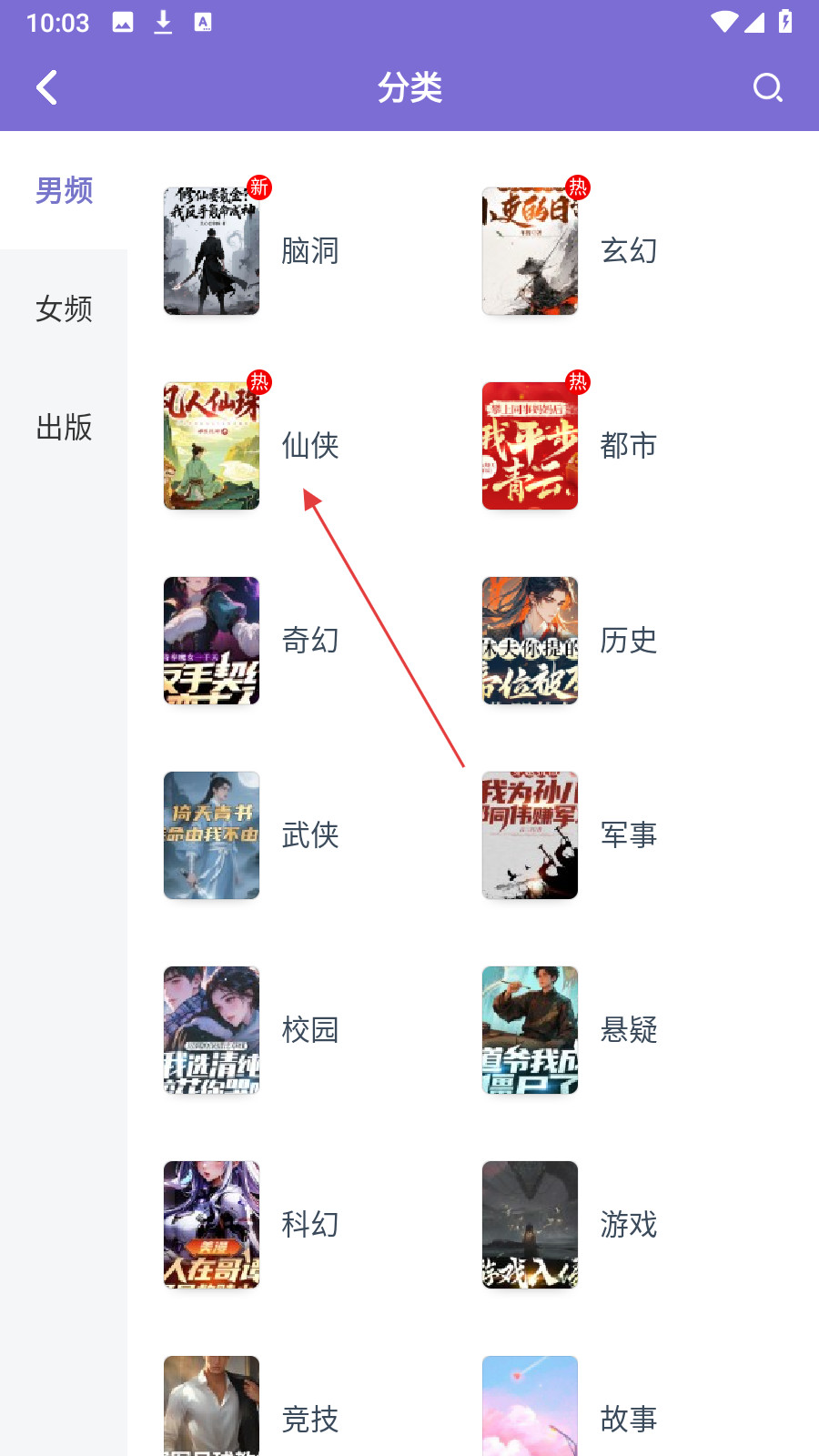 2、在分类页点击【仙侠】进入仙侠书籍列表。