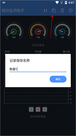 4、点击下图红色箭头所指的保存按钮就可以保存当前震动数据