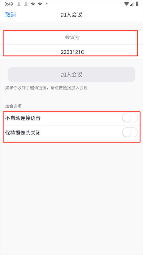 2、输入会议号和会议名称,下方还可以选择是否开启摄像头