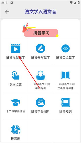 2、在浩文学汉语拼音页面中,点击拼音视频教学选项。