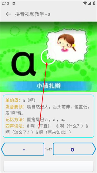 4、点击视频中的播放按钮,即可查看该拼音的教学视频。