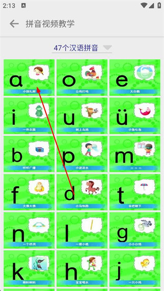 3、在拼音视频教学页面中,选择并点击要学习的拼音。