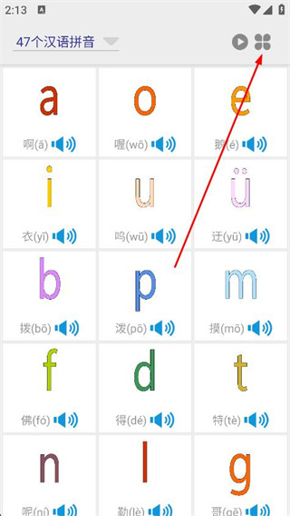 1、打开学汉语拼音学习,找到并点击右上角的菜单图标。