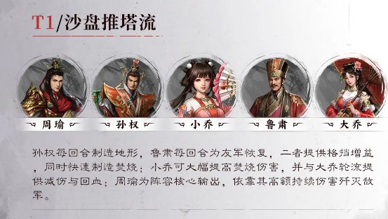 孙权每回合制造地形,鲁肃每回合为友军恢复,二者提供格挡增益同时快速制造焚烧;小乔可大幅提高焚烧伤害,同时提供受伤核复和每回合恢复的特殊增益;周瑜、孙尚香为阵容核心输出,对焚烧目标和地形效果有额外加成。