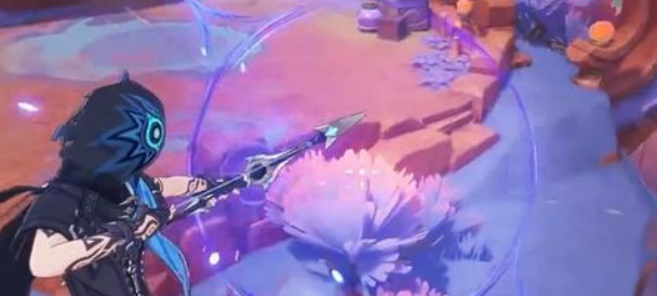 可以进行三段连续弓箭射击,重击时会将雷元素附着在箭矢上形成强力瞄准射击。当玩家长按瞄准按钮时会进入灵觉状态,这种状态下可以从灵谜涂鸦和灵谜纹中汲取力量,让每支箭矢的威力大幅提升。在空中发动下落攻击时,欧洛伦还能释放箭雨造成范围伤害,有效应对聚集的敌人。