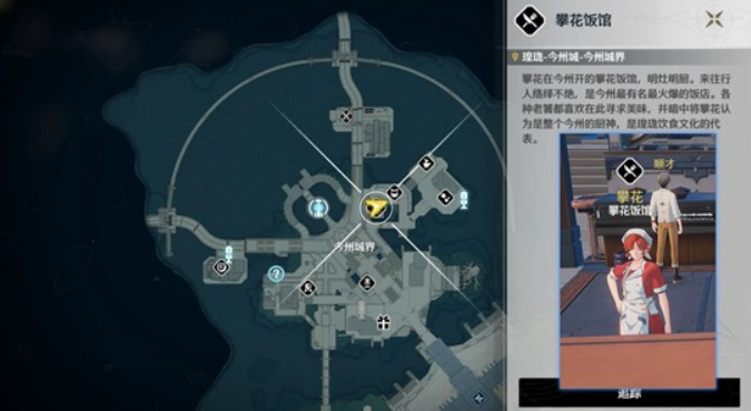 攀花饭馆坐落于瑝珑地区的今州城界,由厨师攀花负责运营。与她互动并选择“我想看看菜单”后,便可浏览可购菜品和食谱。此处可获取的食谱包括龙须酥食谱、小龙包食谱、今州烩食谱、星星酥食谱以及油辣豆腐食谱。这些料理多具地方风味,在鸣潮的世界观设定中也体现了今州城独特的饮食文化背景。