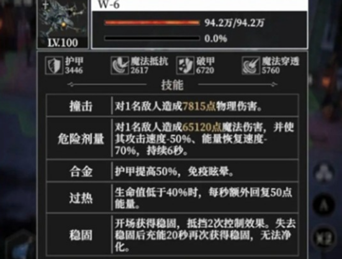 需要迅速处理W-6蝎子的增益状态。进入战斗后立即使用夜生白露技能,该技能可清除boss身上护甲以及+50%的增伤buff。这一操作至关重要,能有效遏制蝎子前期的爆发输出,为后续战斗创造安全环境。在地下城堡4骑士与破碎编年史中,控制敌方增益是许多高难战斗的核心环节。