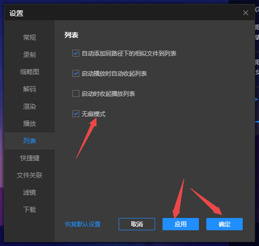 然后找到右侧中的"无痕模式",将其小方框勾选上,最后点击下方中的应用确定就可以了。