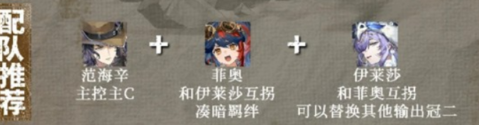 推荐将其与菲奥和伊莱莎共同编入同一阵容,这三者组合不仅能激活暗属性角色之间的羁绊加成,还能实现技能联动。菲奥提供后台增益与能量回复支持,伊莱莎则擅长范围控制,两人共同为范海辛创造安全的输出环境。这样的搭配让整个队伍在推进副本或参与PVP对抗时都具备较强的持续作战能力。
