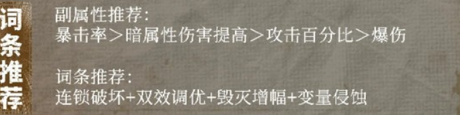 暴击率是范海辛优先需要堆叠的属性之一。足够的暴击可以显著提升他的输出稳定性,避免出现伤害断层。此外,连锁破坏、双效调优与毁灭增幅这三个词条与其技能机制高度契合。尤其是连锁破坏,在面对复数敌人时能逐层提升伤害;而毁灭增幅则直接作用于最终伤害上限,进一步放大其爆发潜力。