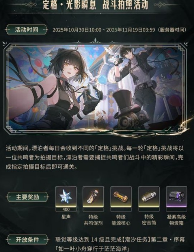 活动期间,漂泊者每日会收到不同的「定格」挑战。每一轮「定格」挑战将以一位共鸣者为拍摄目标,漂泊者需要捕捉共鸣者们战斗中的精彩瞬间,完成指定拍摄目标后即可通关。