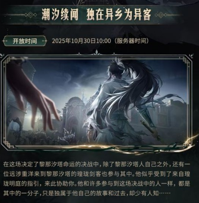 在这场决定了黎那汐塔命运的决战中,除了黎那汐塔人自己之外,还有一位远涉重洋来到黎那汐塔的瑰珑剑客也参与其中。他似乎受到了来自瑰珑明庭的指引,来此协助你。他和许多参与到这场决战中的人一样,都是其中的一分子,只是独属于他自己的故事和过去,却少有人知…