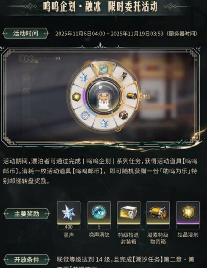 活动期间,漂泊者可通过完成[呜呜企划]系列任务,获得活动道具[呜呜邮币]。消耗一枚活动道具[呜呜邮币],即可随机获赠一份[助呜为乐]特别邮递转盘奖励。