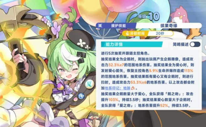 当小禾处于援助位置时,其技能价值大幅提升。释放援助技后,她会随机抛出企鹅或爱心道具,不同组合带来不同效果:若全部为企鹅,则触发七次地系范围伤害;若全为爱心,则为主控角色回复生命值并造成一次范围爆炸;若两者混合,则对敌人进行扫射。更重要的是,当企鹅数量多于爱心时,全队获得攻击力提升;反之则提升全队地系伤害。无论结果如何,该技能必定为敌人附加地系印记,极大提升了队伍后续引爆技能的覆盖率。