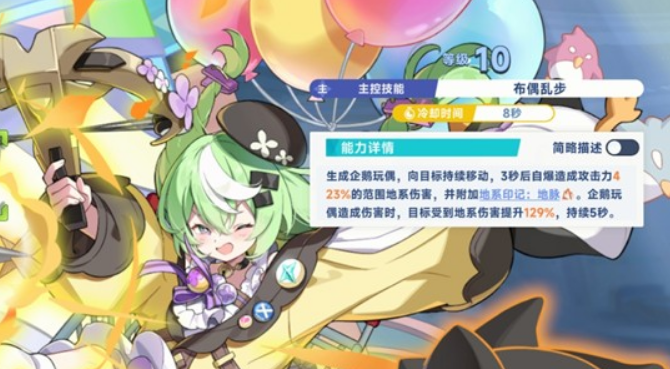 释放技能后,小禾会在场上放置一个企鹅玩偶,该玩偶将锁定目标并缓慢靠近,在三秒延迟后发生爆炸,对范围内敌人造成地系伤害。爆炸不仅会使敌人陷入“地系伤害提升”的减益状态,还会为其附加地系印记。这一印记可被队友的特定技能引爆,从而触发额外伤害加成。此机制让小禾在主控状态下也能为后续角色创造输出环境,具备一定的辅助潜力,但仍不足以支撑她成为主力输出核心。