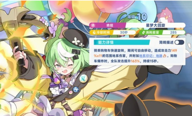 小禾的绝招开启后,她将驾驶购物车在场内高速旋转移动,持续对范围内的敌人造成地系伤害,并为所有被击中的目标施加地系印记。技能结束时购物车发生爆炸,同时为全队提供攻击力增益,持续时间长达15秒。由于该增益覆盖范围广且持续时间长,非常适合在面对高血量BOSS类敌人时释放,确保队友能完整享受加成。配合印记机制,还能为队伍中的地系爆发角色创造极佳的输出窗口。