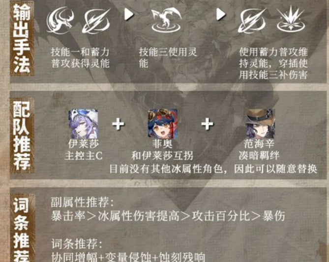 辉烬伊莱莎在队伍搭配上也有明确方向。推荐与非奥组队,两者技能机制互补,能形成良好的协同效应。也可搭配范海辛凑成暗属性羁绊,提升全队属性表现。当前版本中冰属性角色数量较少,范海辛作为优质暗系角色,既能补足属性短板,又能增强队伍整体强度。