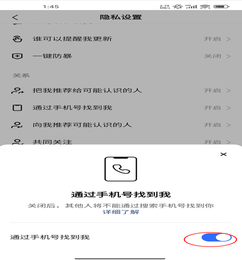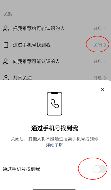关闭后按钮就会显示灰色,并可查看到“通过手机号找到我”选项后面已显示未关闭。