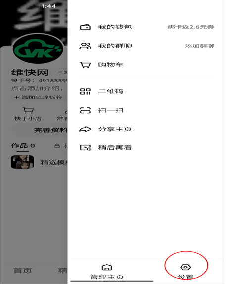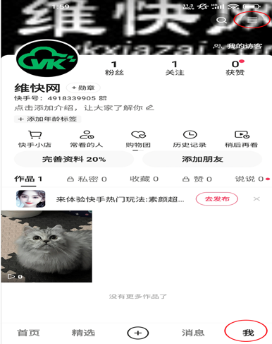 打开快手app,进入到我的界面,点击页面右上角的“三横”图标按钮;