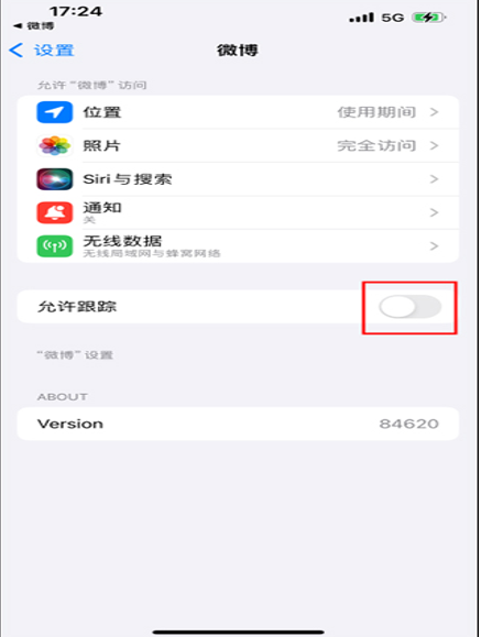 进入到微博的手机系统管理权限页面,将“允许跟踪”选项右侧的开关按钮关闭就不会再显示ip地址了。