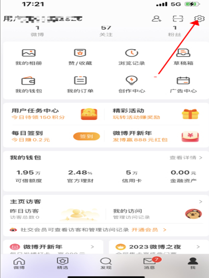 打开微博app,进入到个人中心页面,点击页面右上角的“设置”图标按钮;