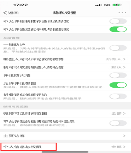 进入到隐私设置页面,滑动屏幕到页面底部,点击“个人信息与权限”选项;