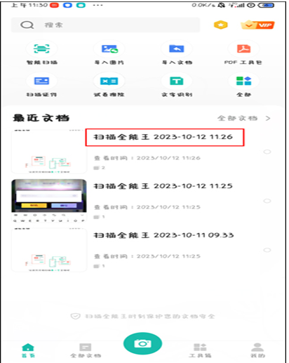 打开扫描全能王app,进入app首页,在最近文档列表下选择一个需要合并多张图片的文档并点击进入;