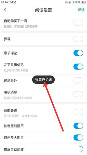 进入到阅读设置界面后,我们再滑动弹幕后面的滑块至灰色即可。