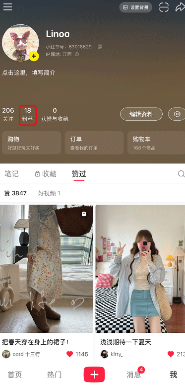 点开“我”点击“粉丝”可以注意下,此时是18个粉丝