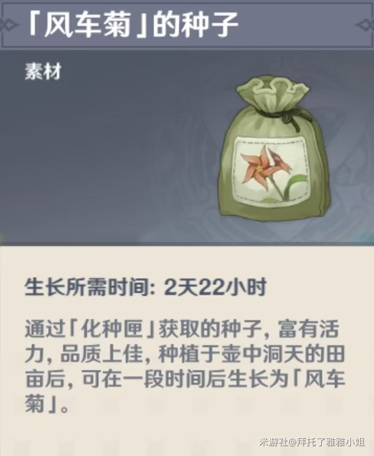 还可带上小道具化种匣去收集风车菊,会同时获得风车菊和风车菊种子,风车菊种子可以去尘歌壶种植,但要注意哦,化种匣获取每种植物种子在背包的上限是20个