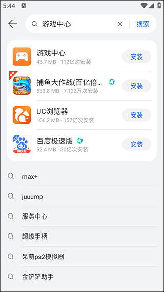 在搜索框内输入要下载的应用程序的名称,例如输入【游戏中心】,然后点击“安装”按钮;