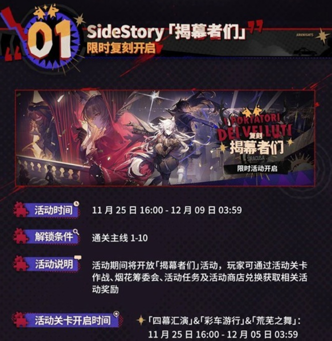《明日方舟》复刻活动SideStory揭幕者们正式开启!本次活动将于11月25日至12月9日期间限时开放。玩家们可以通过参与活动关卡作战、完成“烟花筹委会”任务、挑战活动任务以及前往活动商店兑换,取得丰富的活动奖励!有兴趣的玩家们可以查阅以下活动资讯!