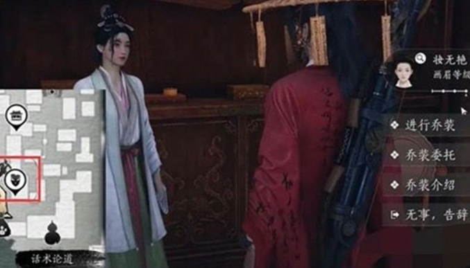 完成临摹后找到乔装师傅,选择伪装成梁某的形象。系统会弹出四个指示选项,确认乔装完成后前往寻找撑着黄色油纸伞的月牙NPC。与月牙对话后根据指引找到存放《论语》的小茅草屋,这里需要翻墙进入获取物品。