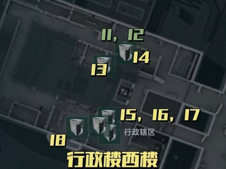 紧接着我们来到行政楼西楼图片标记点这里,接爆破铁门的任务才能进入搜索到11和12号电脑机箱;随后我们来到拉闸房门口这里,就能找到13号电脑机箱,14号电脑机箱就在拉闸房隔壁的房间内;15、16、17号电脑机箱需要我们来到西楼监视室(二楼电梯口旁边)这里刷卡进入才能搜索到;随后来到隔壁刷新小免保的房间,在办公桌底下就能找到18号电脑机箱了。