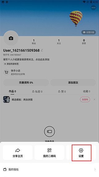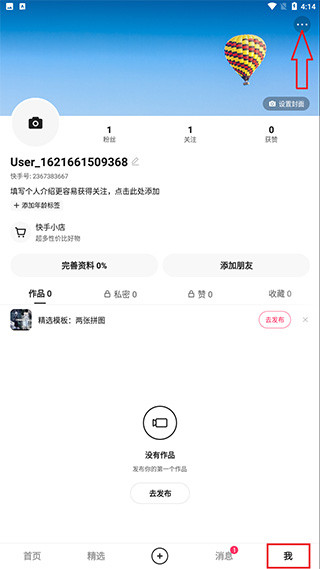 首先进入快手首页,点击下方我的,进入后点击右上方的三个点图标