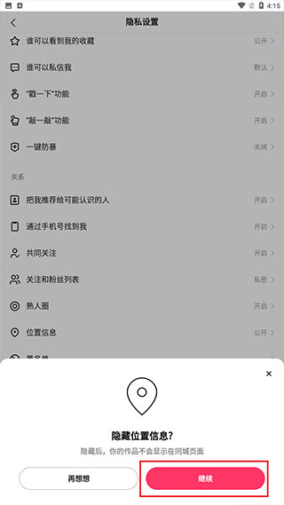 最后点击继续关闭,这样别人就看不到你的IP地址了,同时你的作品也不会被放在同城的作品集上