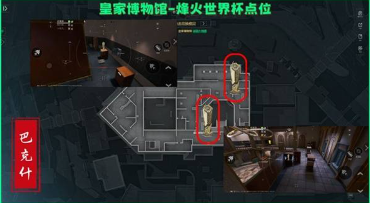 皇家博物馆一共有2个点位,图片从左到右位置依次在:2楼拉闸点旁边的展柜上面和2楼过道的玻璃展柜里面,所有展柜里都有可能刷新,具体位置参考图片即可