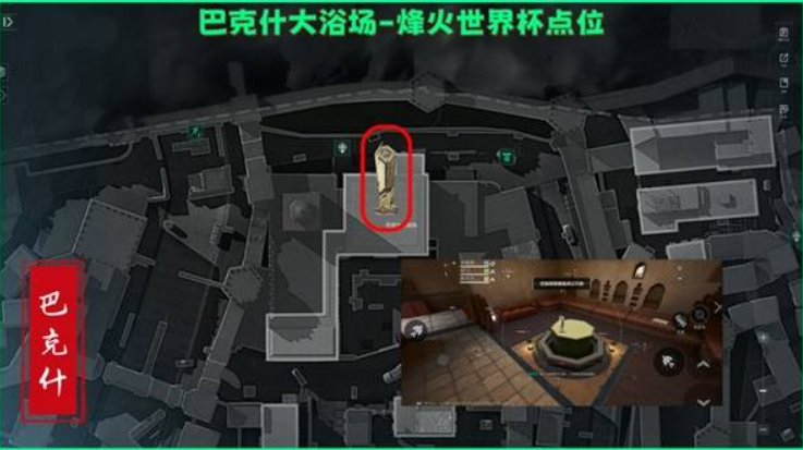 巴克什大浴场一共有1个地点,位于:地图最北边方向大浴场1楼中心的喷泉上面(低画质看不到喷泉),具体位置参考图片即可——