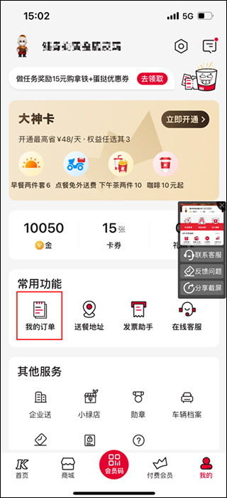 来到个人中心页面,找到并点击常用功能列表下的“我的订单”选项;