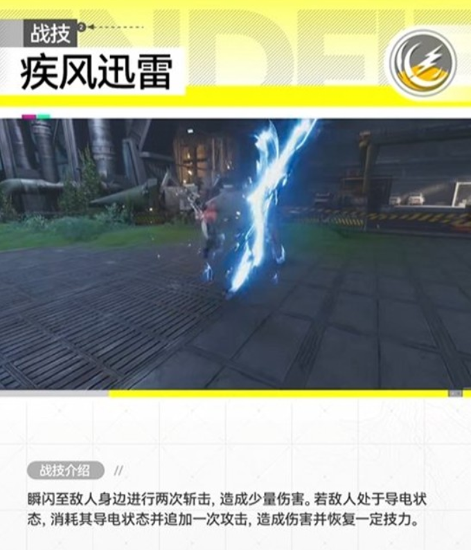 瞬闪至敌人身边进行两次斩击,造成少量伤害。若敌人处于导电状态,消耗其导电状态并追加一次攻击,造成伤害并恢复一定技力。
