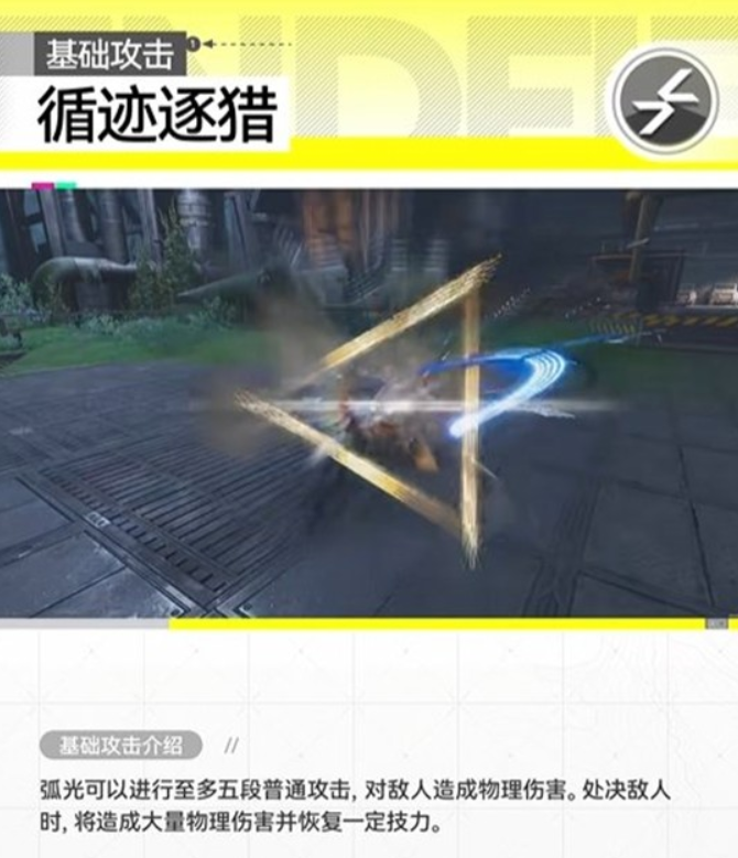 弧光可以进行至多五段普通攻击,对敌人造成物理伤害。处决敌人时,将造成大量物理伤害并恢复一定技力。